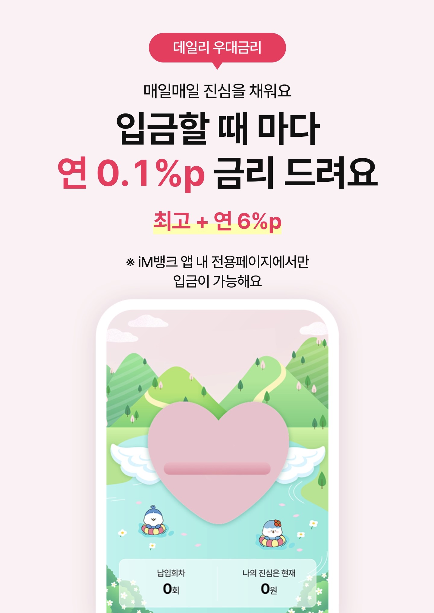 상품은 자동이체가 아닌 iM뱅크 앱을 통해 직접 납입하는 형태이므로, 앱 가입 후 입출금 계좌 사전 신청을 미리 진행하는 것이 좋습니다.
