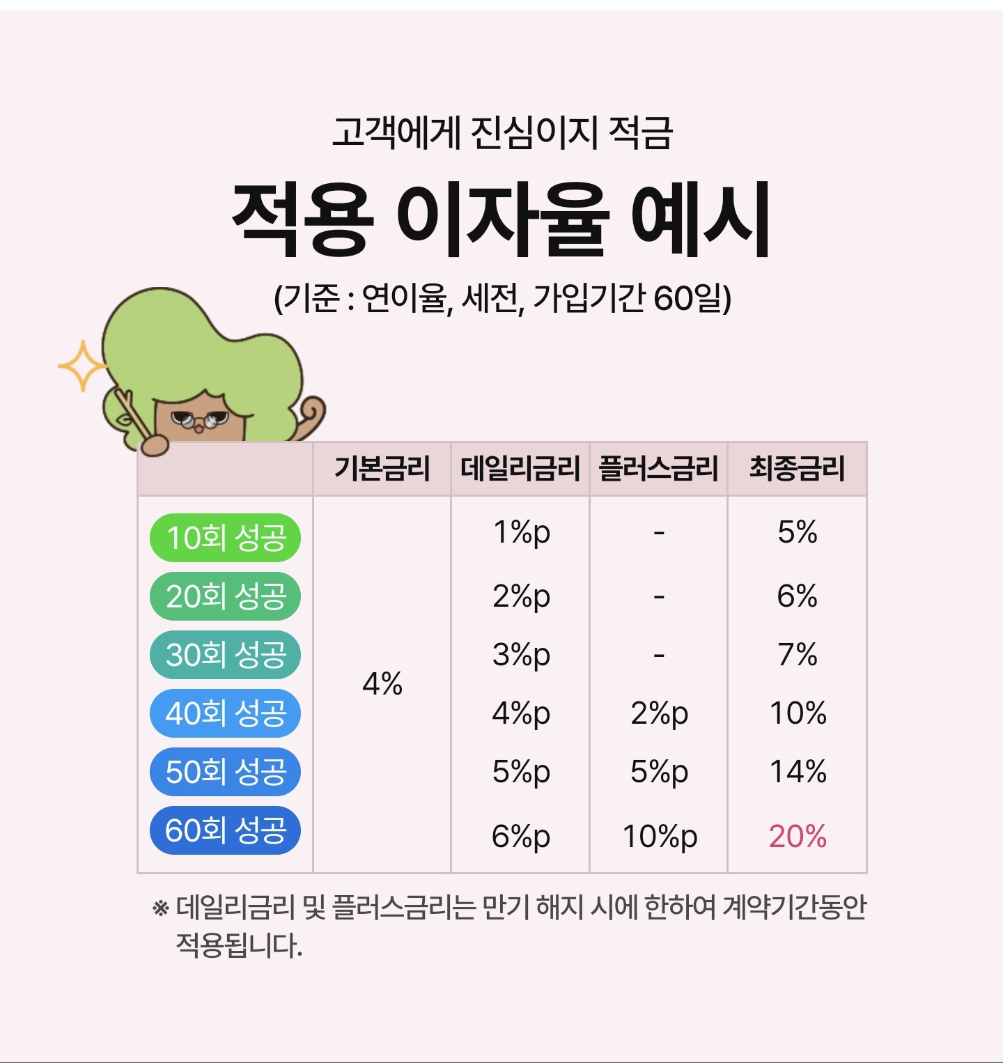 '고객에게 진심이지 적금'은 기본금리 연 4%에 납입 조건에 따라 최고 연 20%의 금리가 적용됩니다. 매일 납입 시 귀여운 애니메이션과 매회 추가되는 데일리 우대금리(최고 연 6%)와 플러스 우대금리(최고 연 10%)가 적용되는 '펀 세이빙 적금' 형태입니다.