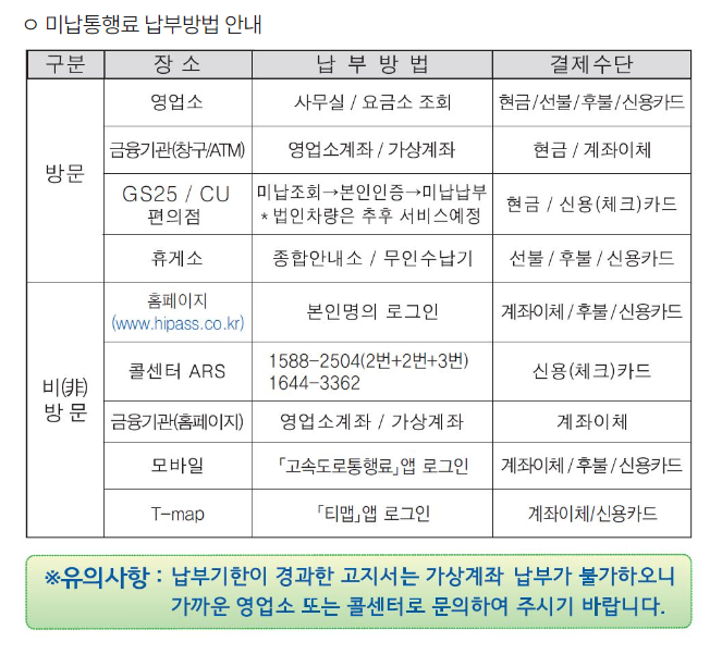 홈페이지에서 납부할 수 없는 경우 영업점을 방문하여 납부하거나 전국 모든 은행 영업점이나 현금자동입출금기, 고속도로 편의점(GS25, CU), 종합안내소 및 휴게소 무인수납기에서 납부할 수 있습니다. 은행에서 입금할 때는 미납통행료가 미납차량번호로 관리되므로 입금표에 차량번호를 꼭 입력해야 합니다.