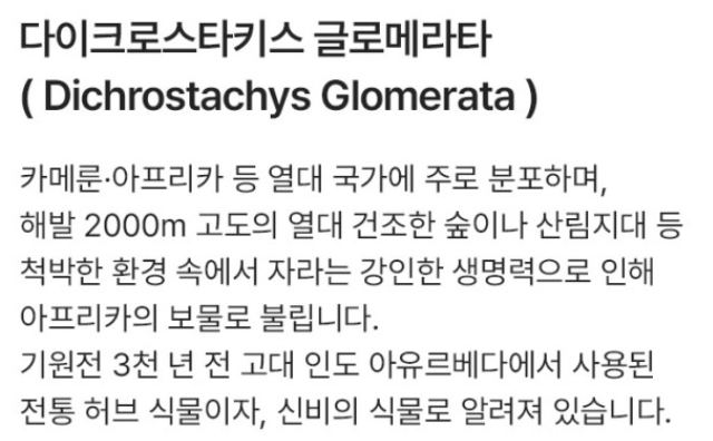 이 식물은 해발 2000미터 고도의 건조한 숲과 산림 지대처럼 척박한 환경에서도 잘 자라는데, 아프리카에서는 보물로 여겨지고 있습니다. 이 허브 식물은 3000년 전부터 고대 인도의학 아유르베다에서 사용되었으며, 세네갈 우표에도 등장한 적이 있었습니다.