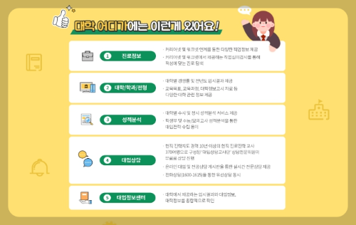 현재 고1, 2 학생에게는 고교학점제 안내 서비스 등 관련 정보를 우선 제공하고, 고3 학생에게는 수시 모집요강, 대학별 전형 특징 분석 등 올해 대입 준비에 필요한 정보를 제공하고 있습니다.