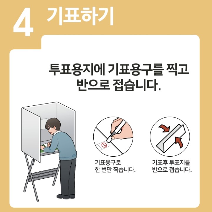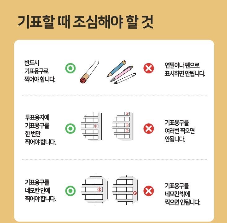 - 기표할 때는 반드시 제공된 도장만 사용해야 하며, 볼펜이나 체크 표시(X)는 무효 처리됩니다.