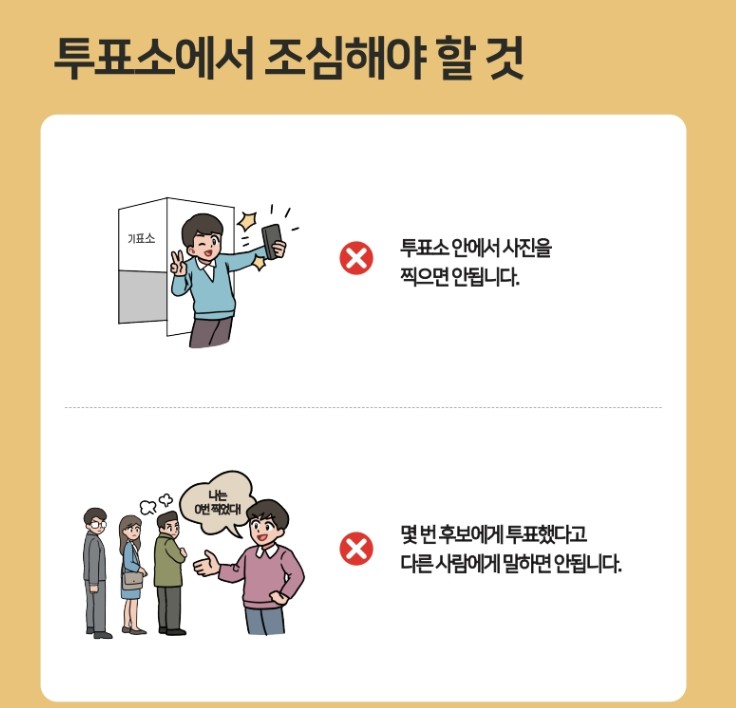 - 기표소 내에서는 촬영이 금지되어 있으므로 휴대폰은 꺼두는 것이 좋습니다.