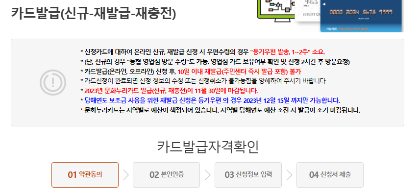 카드 발급기간은 2023. 2. 1(수) ~ 2023. 11.30(목)로 올해 발급 받을수 있는 기한이 얼마 안남았습니다. 남은 금액은 이월되지 않으니 빨리 신청하시어 남은 한달동안 지원금을 쓰셔야 합니다.