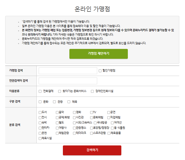 검색하기"를 통해 검색 된 가맹점에서만 이용이 가능합니다. 일부 온라인 가맹점 이용은 본 사이트를 통해 접속해야 이용 및 할인 적용이 가능합니다. 본 화면의 정보는 가맹점 폐업 또는 업종변경, 가맹점 정보변경 등으로 현재 정보와 다를 수 있으며 문화누리카드 결제가 불가능할 수 있으니 유의하시기 바랍니다. 기타 자세한 내용은 가맹점으로 확인 하시기 바랍니다. 문화누리카드의 가맹점을 제안하여 주시면 적극 검토하도록 하겠습니다. 가맹점 제안하기를 통해 접수되는 모든 제안은 주기적으로 내부에서 검토되며, 별도로 회신을 드리지 않습니다.