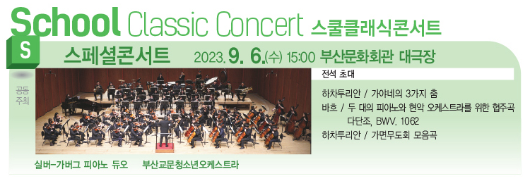 [부산교문청소년오케스트라] 부산마루국제음악제 스쿨클래식콘서트 - 일시: 2023.9.6.(수) 15:00~16:00 - 장소: 부산문화회관 대극장(대연동) - 관람대상: 초·중·고학생, 교직원, 학부모 및 일반시민(