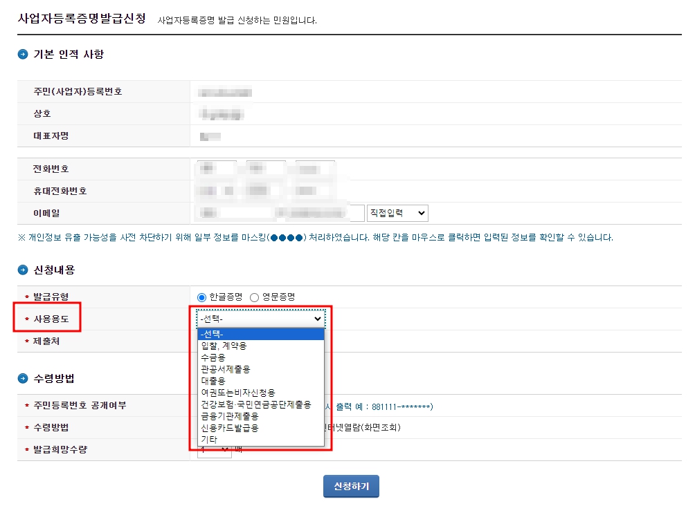 화면이 바뀌면 자신의 주민번호 사업자등록번호가 맞는지 확인하고 사업자등록증명원의 사용용도를 선택합니다.