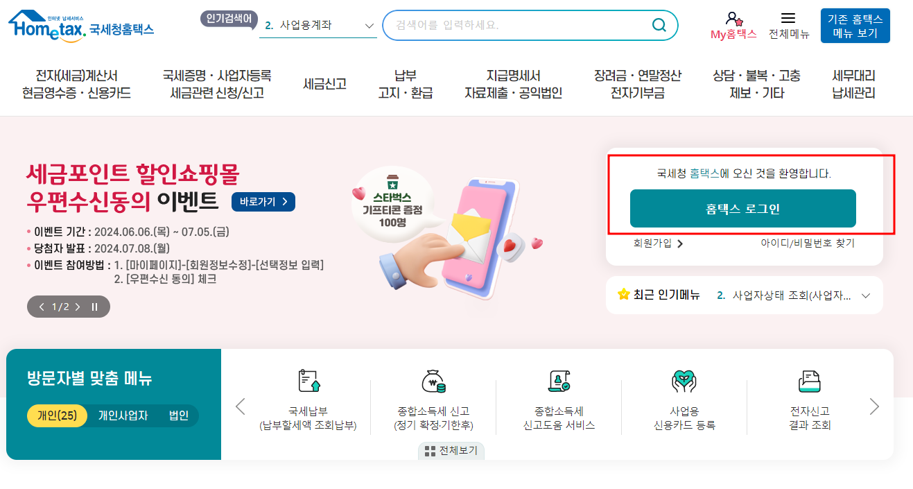 첫번째로 홈택스 홈페이지에 로그인 합니다.