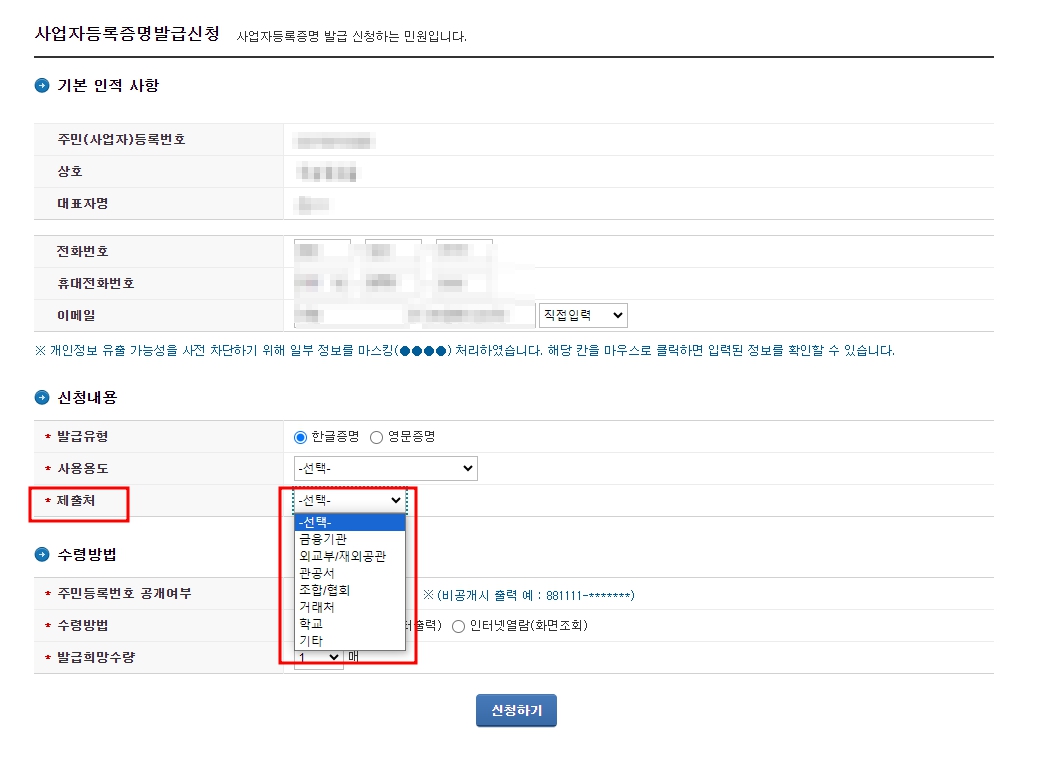 사업자등록증명원을 어디에 제출할 것인지 선택합니다.