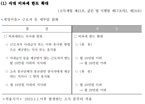 2023 연말정산부터 식대 비과세 한도는 월 10만원에서 20만원으로 올라가게 되었습니다. 근로자가 사내 급식이나 유사한 방법으로 제공받는 식사또는 음식물에도 비과세 혜택을 받을 수 있습니다.