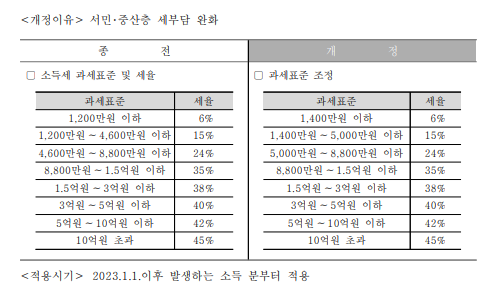 소득세 과세표준 구간도 조정되었는데, 소득 수준에 따라 나뉘는 구간 중 하위 3개 구간의 기준 금액이 상향조정되었습니다. 1400만원 이하 6%, 1400만원 초과5000만원 이하 15%, 5000만원 초과8800만원 이하 24% 세율이 적용됩니다.