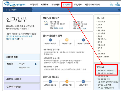 메뉴 찾기 - 합산배제 신고 ☞ 신고/납부 > 일반신고 > 종합부동산세 합산배제신고(제외신고 포함) - 과세특례 신고 ☞ 신고/납부 > 일반신고 > 종합부동산세 과세특례신고