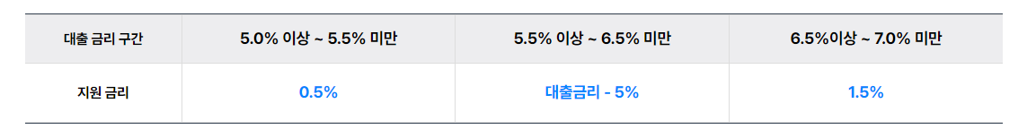 - 금리가 5.3%일 경우 지원금리구간 5.0%~5.5%미만으로 지원금리가 0.5%로 지원금액은 25만원