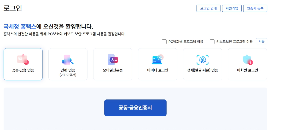 - 홈택스 사이트 접속 ( https://www.hometax.go.kr ) 공동인증서 또는 간편 인증서로 로그인