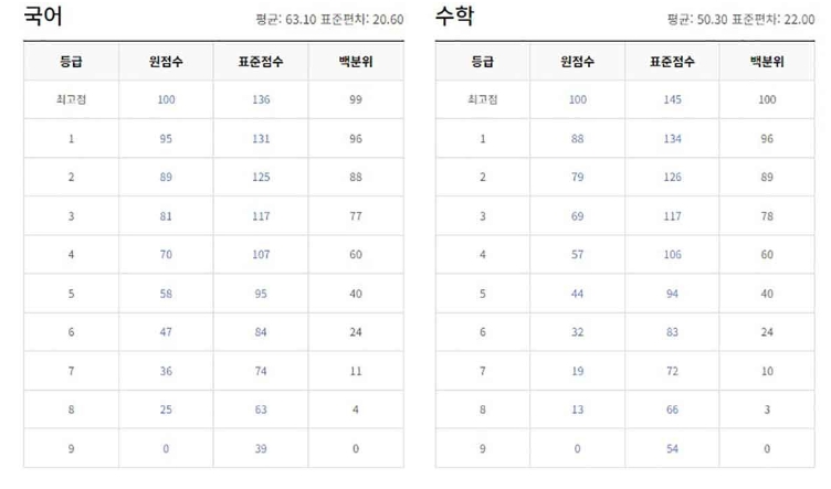고3 모의고사의 경우, 메가스터디와 이투스가 발표한 표준 점수 기준으로 등급컷은 국어가 각각 133점과 129점, 수학이 각각 136점과 139점으로 나왔습니다. 이를 바탕으로 2등급은 국어 125점, 수학 128점, 3등급은 국어 117점, 수학 118점으로 설정되었습니다.