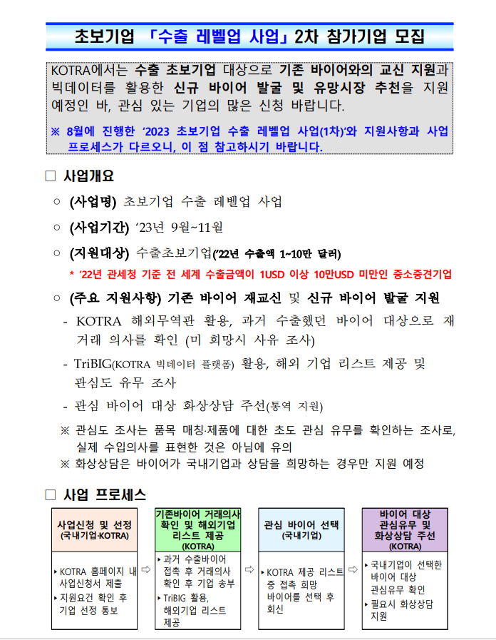 KOTRA에서는 수출희망기업 대상 신규/기존 거래 바이어 연결 지원을 위해 아래와 같이 "초보기업 수출 레벨업" 사업을 진행하오니 관심기업의 많은 참여를 부탁드립니다.
