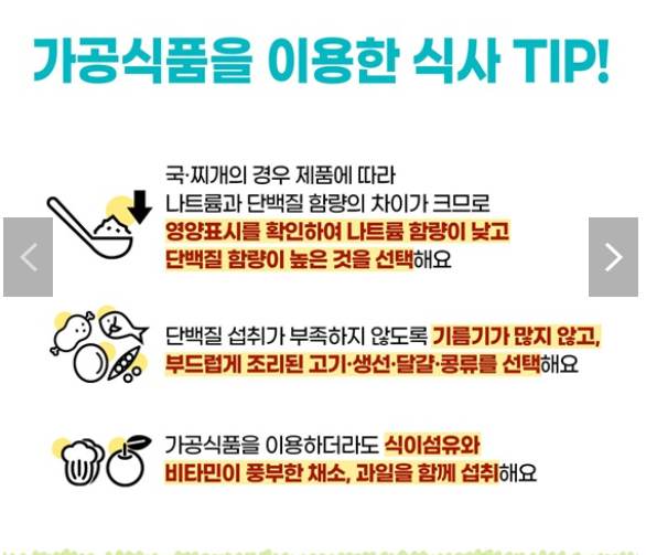 ■ 가공식품은 무조건 나쁘다고 생각하시나요? 식사 준비가 힘든 상황이거나 영양소 함량, 특별한 관리가 필요한 경우 밀키트, 가정간편식, 고령친화식품, 특수의료용도 식품 등을 이용하여 영양의 균형을 맞추어 먹을 수 있어요.