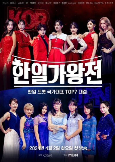 4월 2일 최초로 한일간은 트로트 대전이 시작되었습니다. 우리나라에서는 투표 1등이었던 전유진을 포함한 현영가왕의 TOP 7 마이진, 박혜신, 마리아, 김다현, 린, 별사랑이 출전하며 일본 대표로는 TROT GIRLS JAPAN이라는 프로에서 TOP7을 한 가수들 출연합니다.